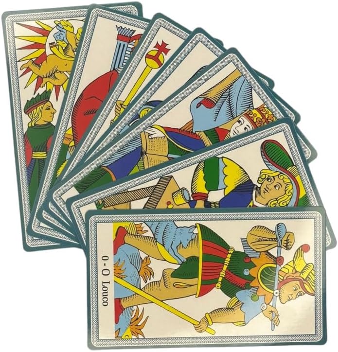 Baralho de 22 cartas do Tarô de Marselha, confeccionadas em papel cartão resistente e de alta qualidade, com cores vivas e desenhos detalhados
