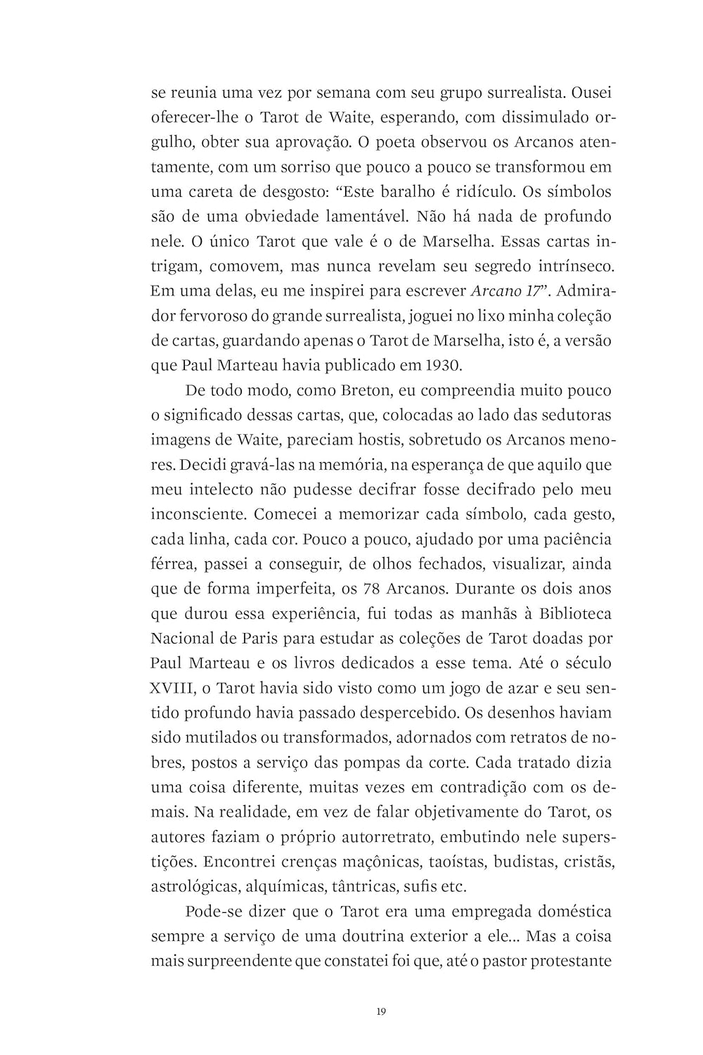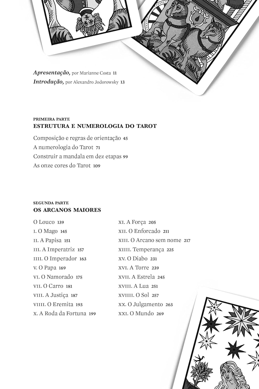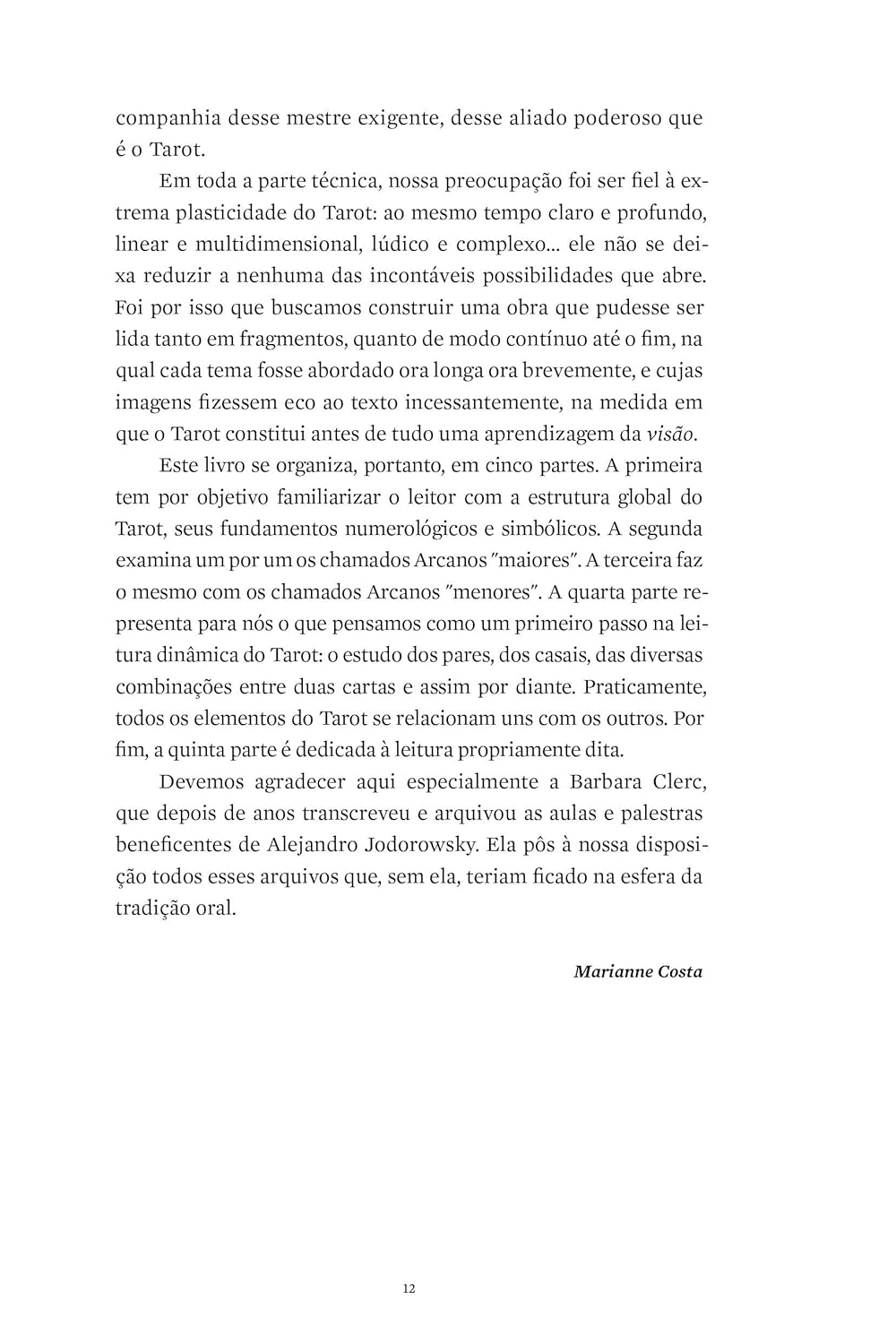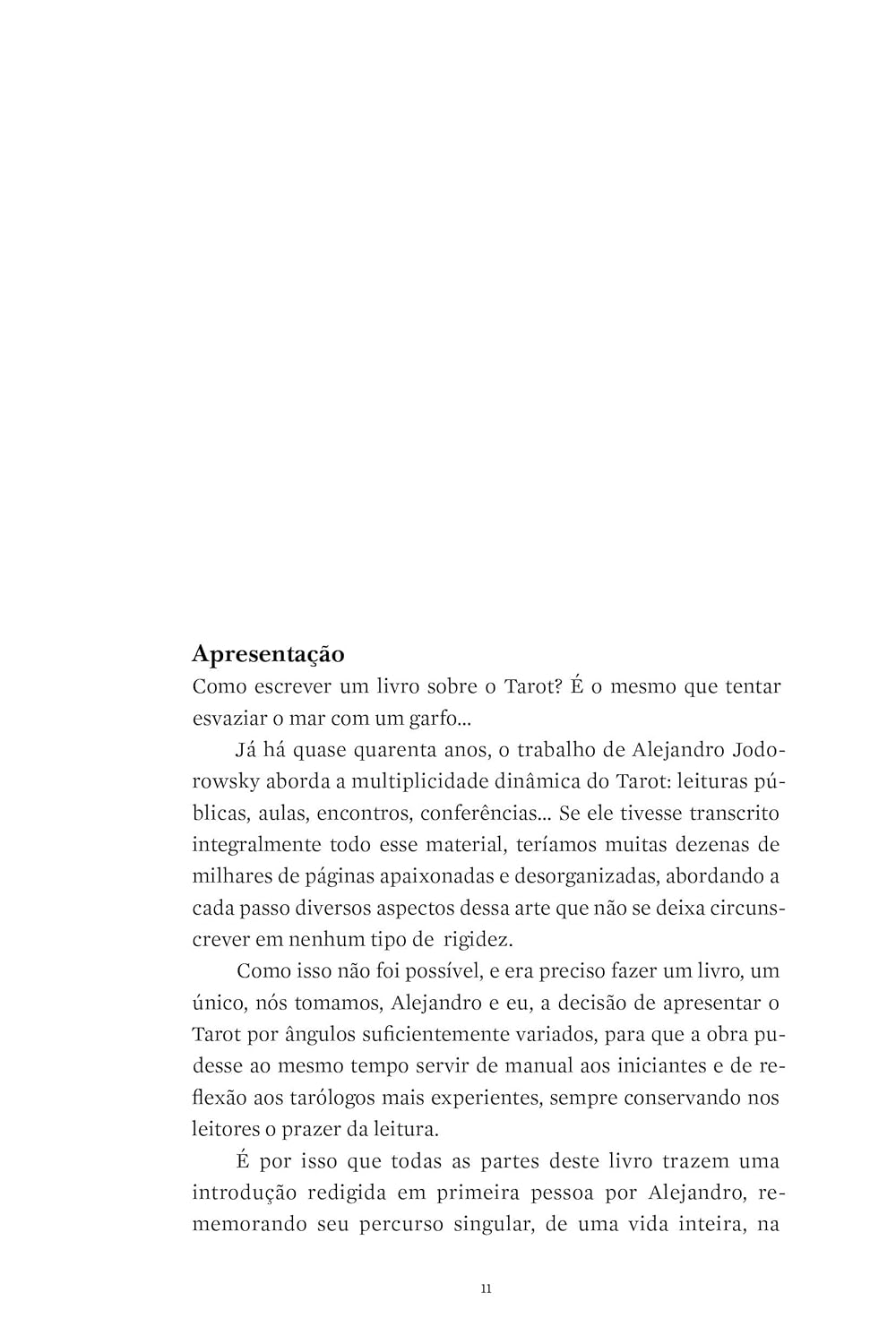 Este livro, já um clássico, vem sendo aclamado como um marco no entendimento do Tarot em nossos tempos. Com ele, Alejandro Jodorowsky, que começou seus estudos do Tarot nos anos 1950 e é reputado como um dos maiores especialistas no assunto, demonstrou que, para além de um simples sistema de adivinhação, o Tarot é mais que tudo um poderoso instrumento de autoconhecimento e representação da estrutura da alma. O Caminho do Tarot mostra que o conjunto de cartas é estruturado como um templo, uma mandala, uma “catedral nômade” cujas partes – as 78 cartas, ou arcanos – devem sempre ser vistas levando em conta a estrutura como um todo. Esse entendimento é essencial para apreender seu simbolismo herméti co. Neste livro, a descrição de cada arcano maior inclui suas palavras chave, seus significados, as interpretações tradicionais e uma seção na qual as cartas falam por elas mesmas. Jodorowsky com Marianne Costa exploram as associações secretas dentro da hierarquia das cartas e suas correspondências com as energias internas dos seres humanos. Levam então a arte da leitura do Tarot a profundidades nunca vistas antes.