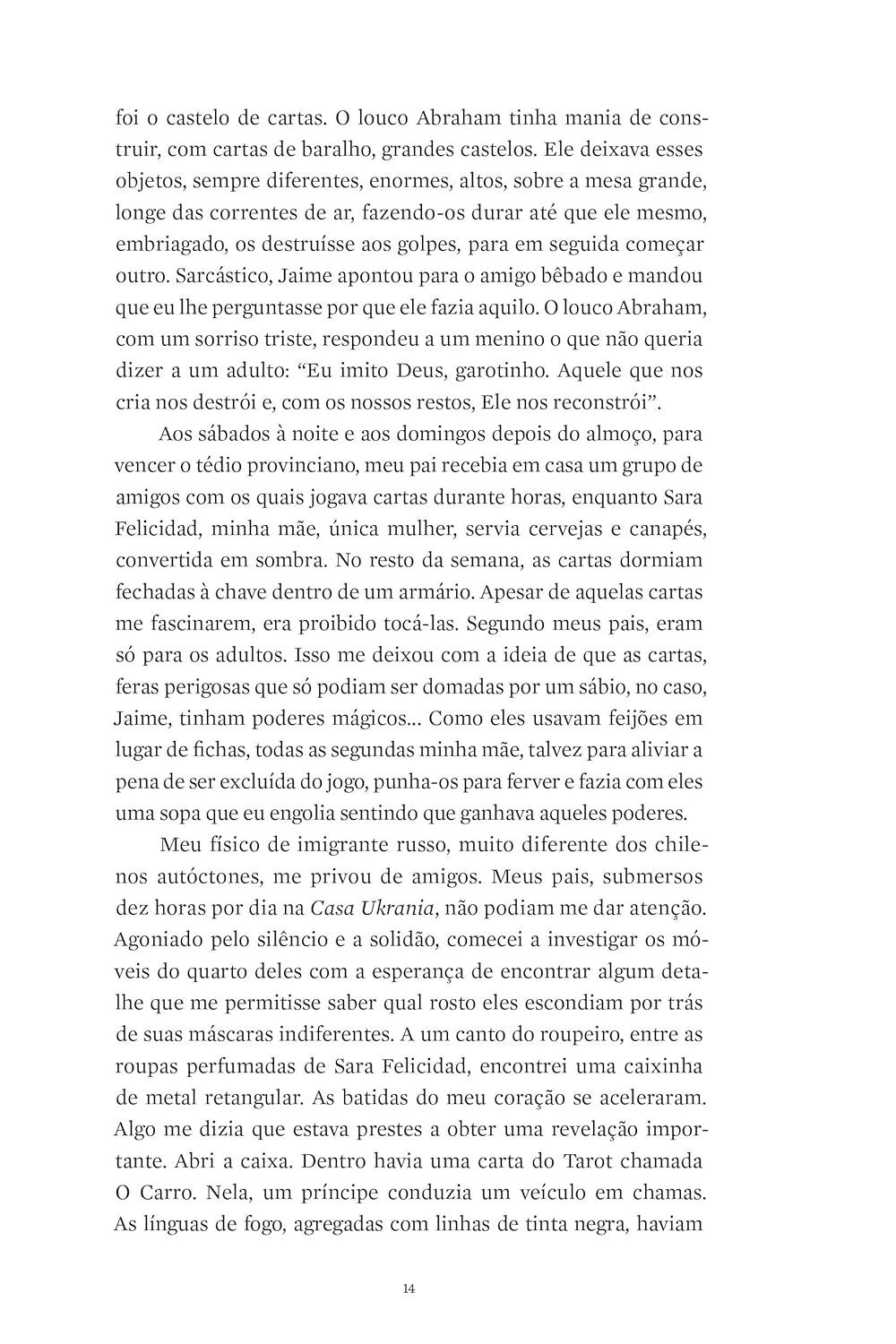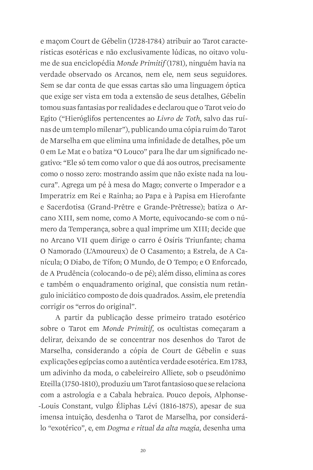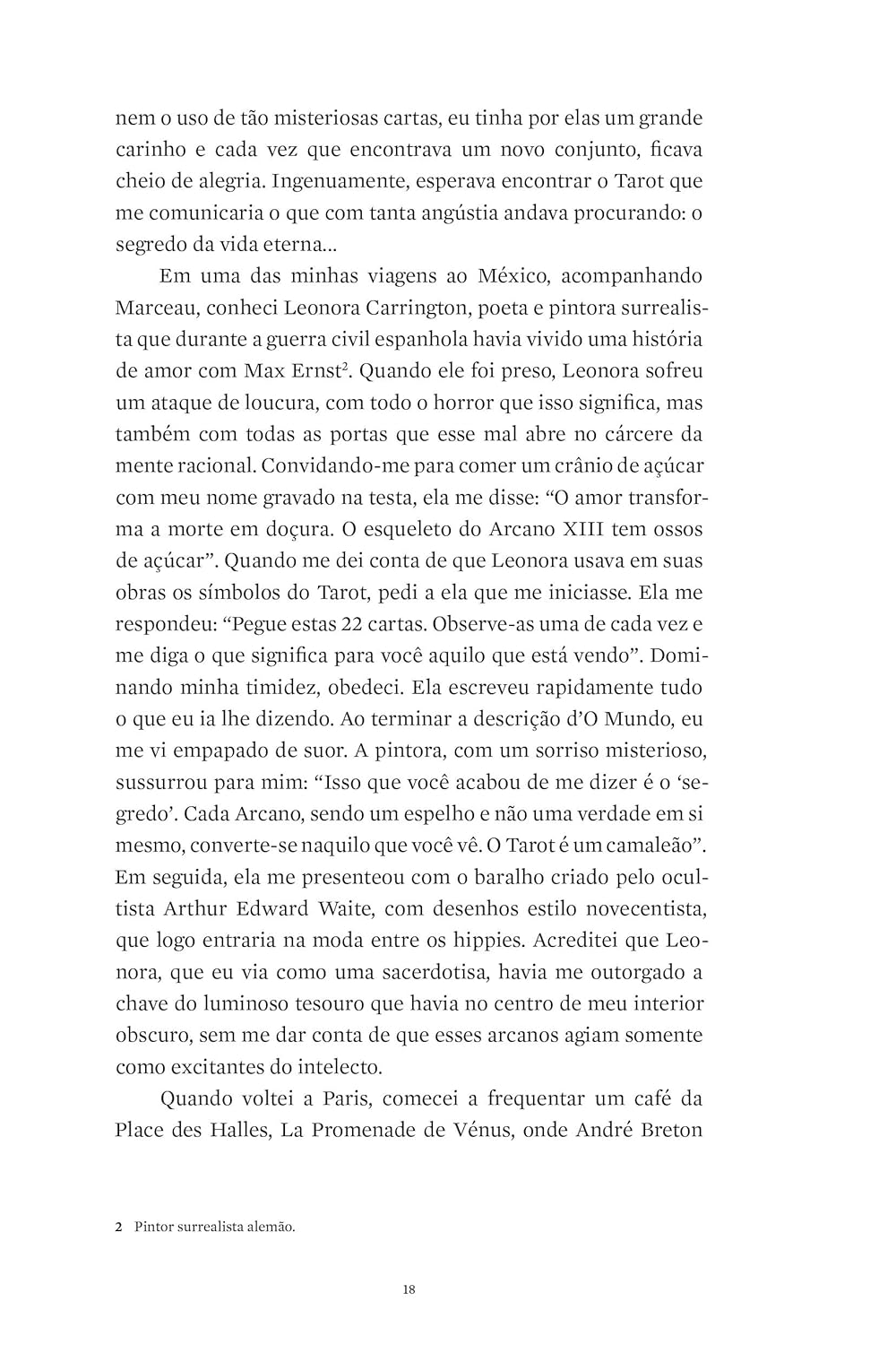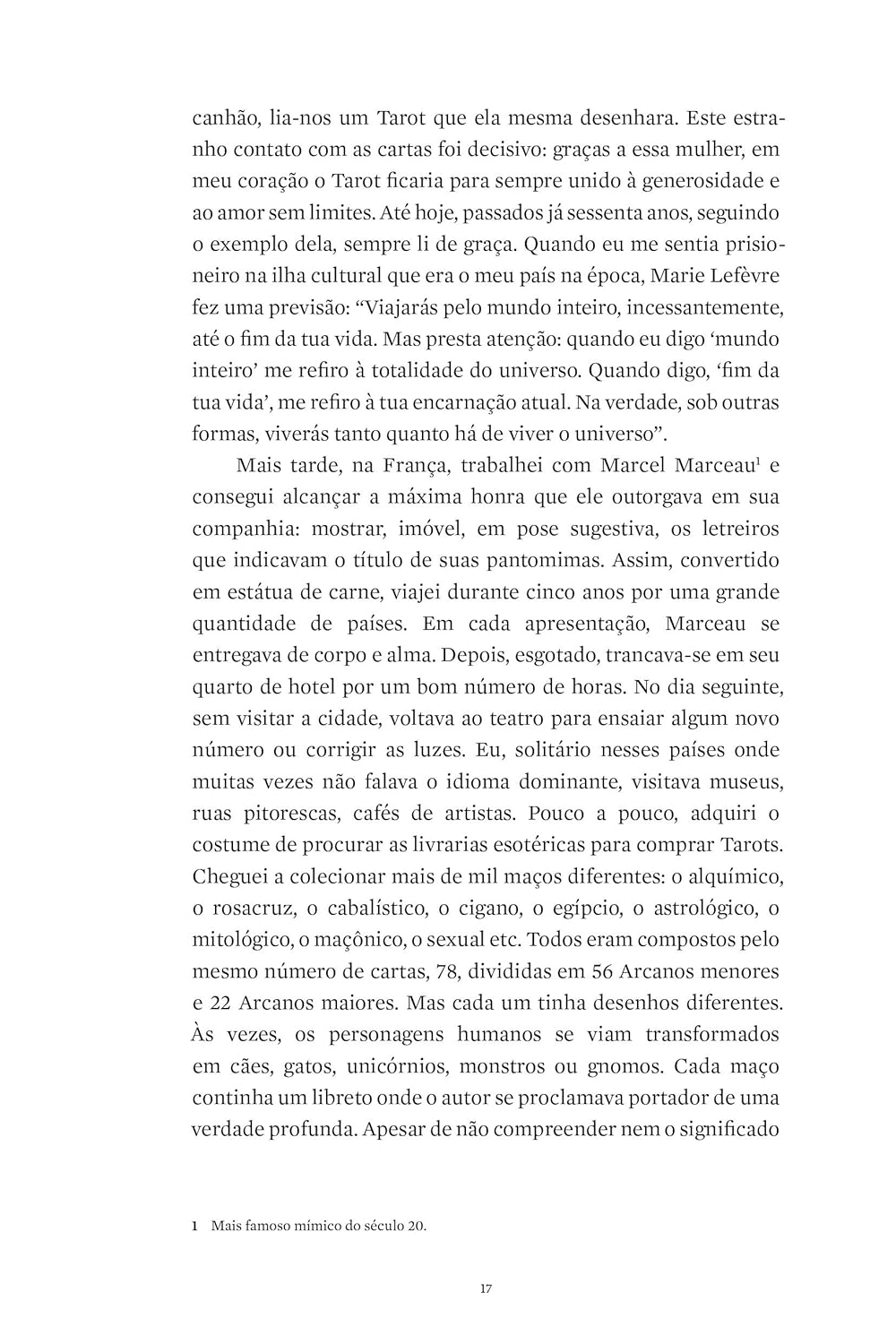 Este livro, já um clássico, vem sendo aclamado como um marco no entendimento do Tarot em nossos tempos. Com ele, Alejandro Jodorowsky, que começou seus estudos do Tarot nos anos 1950 e é reputado como um dos maiores especialistas no assunto, demonstrou que, para além de um simples sistema de adivinhação, o Tarot é mais que tudo um poderoso instrumento de autoconhecimento e representação da estrutura da alma. O Caminho do Tarot mostra que o conjunto de cartas é estruturado como um templo, uma mandala, uma “catedral nômade” cujas partes – as 78 cartas, ou arcanos – devem sempre ser vistas levando em conta a estrutura como um todo. Esse entendimento é essencial para apreender seu simbolismo herméti co. Neste livro, a descrição de cada arcano maior inclui suas palavras chave, seus significados, as interpretações tradicionais e uma seção na qual as cartas falam por elas mesmas. Jodorowsky com Marianne Costa exploram as associações secretas dentro da hierarquia das cartas e suas correspondências com as energias internas dos seres humanos. Levam então a arte da leitura do Tarot a profundidades nunca vistas antes.