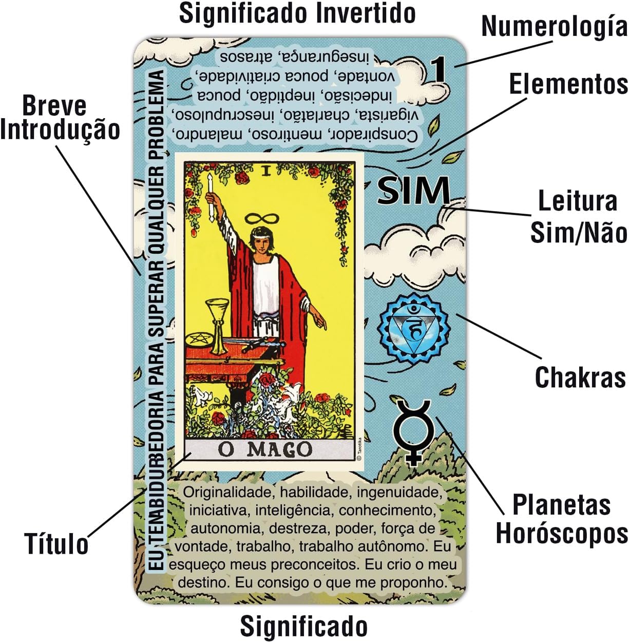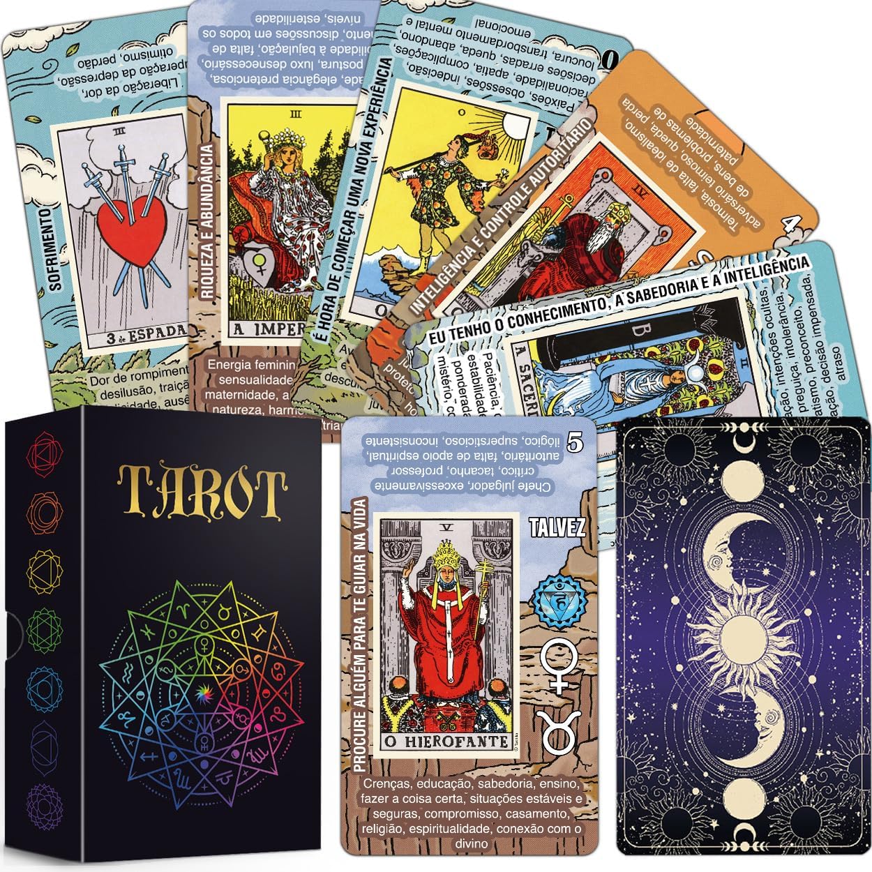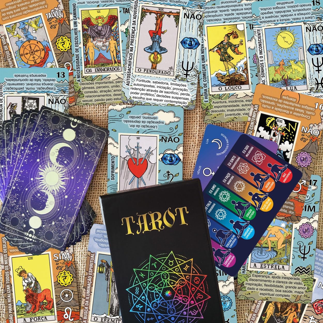 UM BARALHO DE TARÔ VERSÁTIL ADEQUADO PARA LEITORES DE TODOS OS NÍVEIS – Com explicação de cartas de cabeça para cima e invertidas, palavras-chave, símbolos de chacras, correspondências planetárias, associações zodiacais, correspondências elementares, bem como afirmações para melhorar a precisão nas leituras.