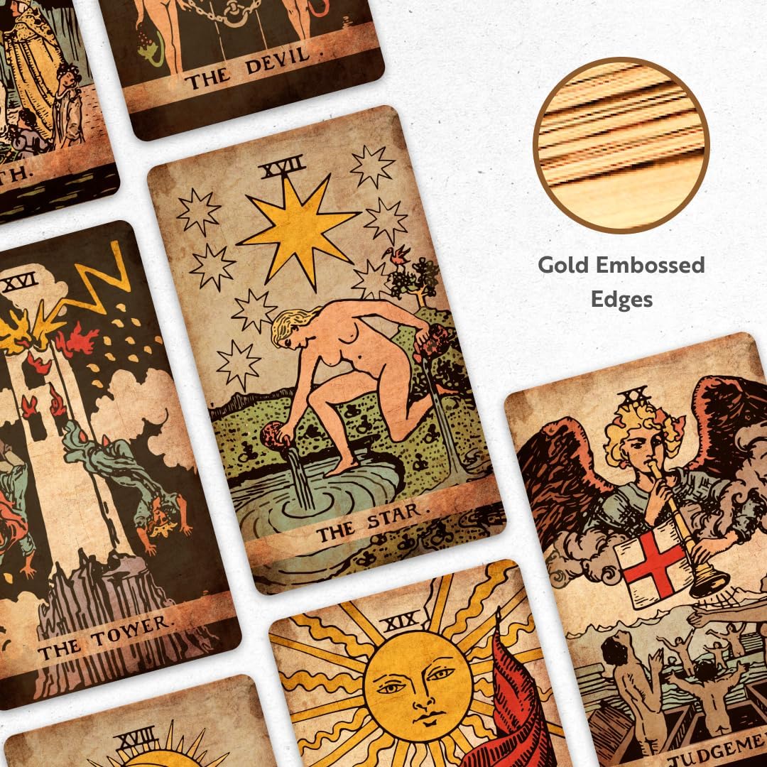 SINTA O TOQUE AGRADÁVEL – O design exclusivo com detalhes nítidos e bordas em folha de ouro irá satisfazer qualquer pessoa que procure um belo baralho de tarô. O verniz fosco de alta qualidade e as bordas arredondadas tornam-nas particularmente confortáveis e agradáveis ao toque durante o embaralhamento.