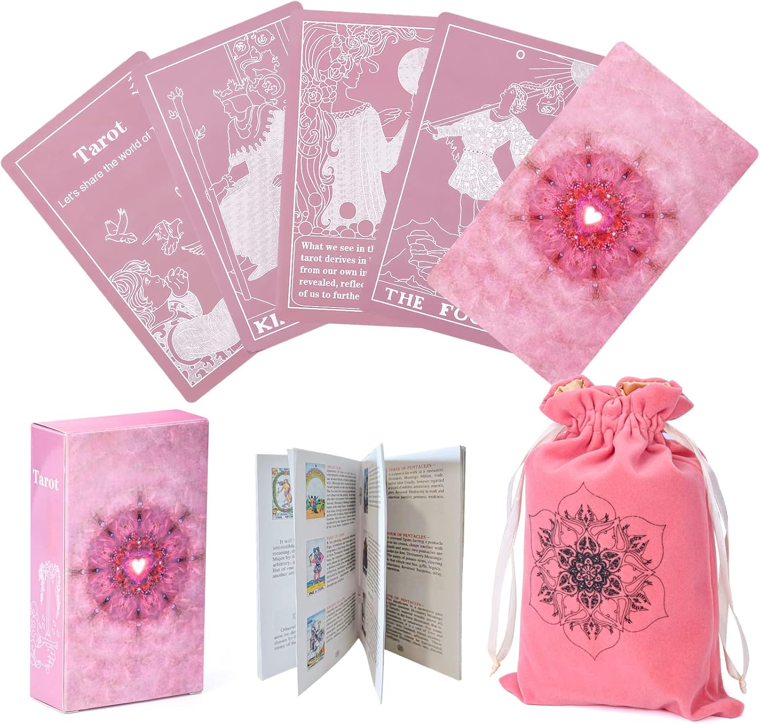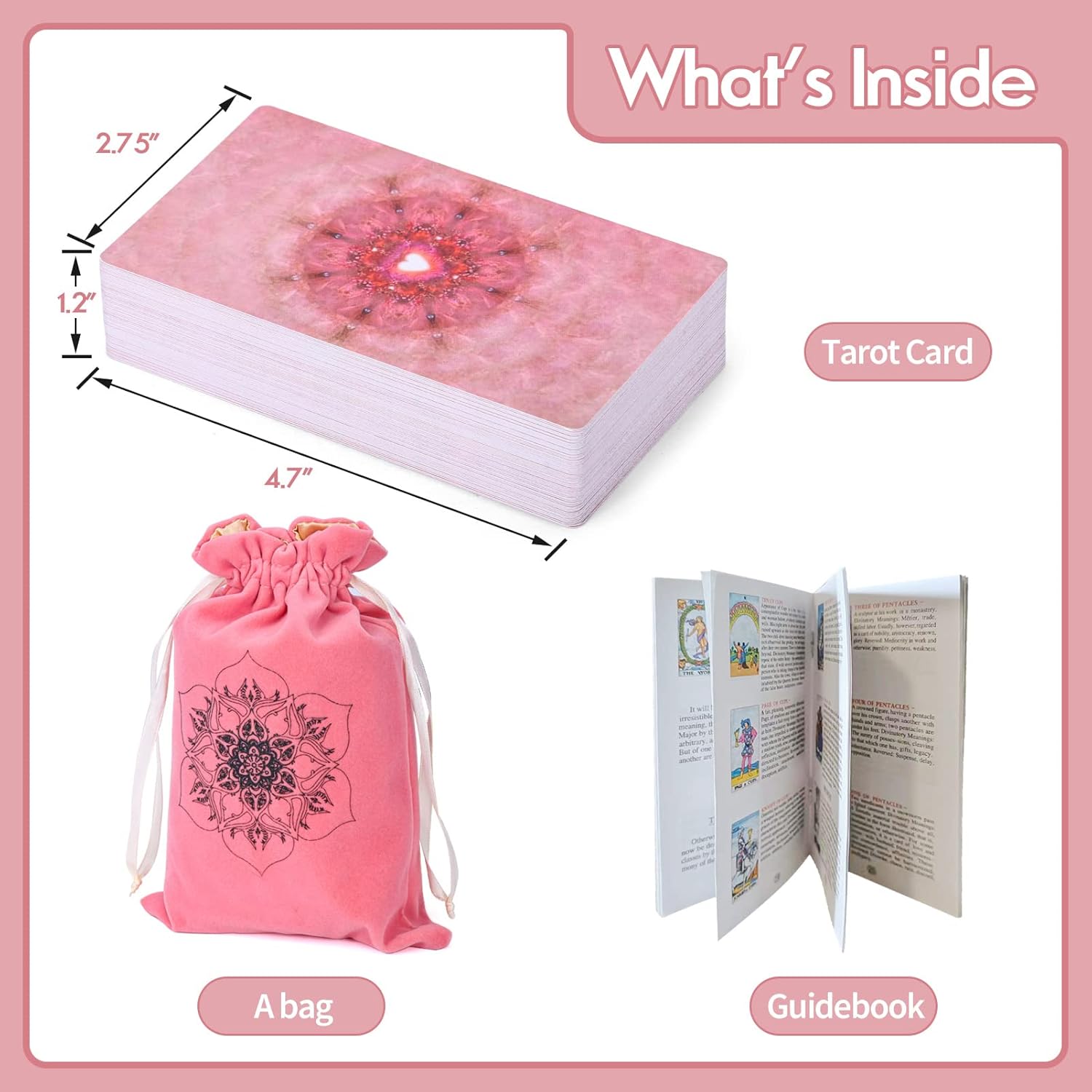 O pacote inclui: Baralho de 78 cartas de tarô, bolsa de veludo para tarô, cartas de tarô com guia. Tamanho: 7 x 12 cm.