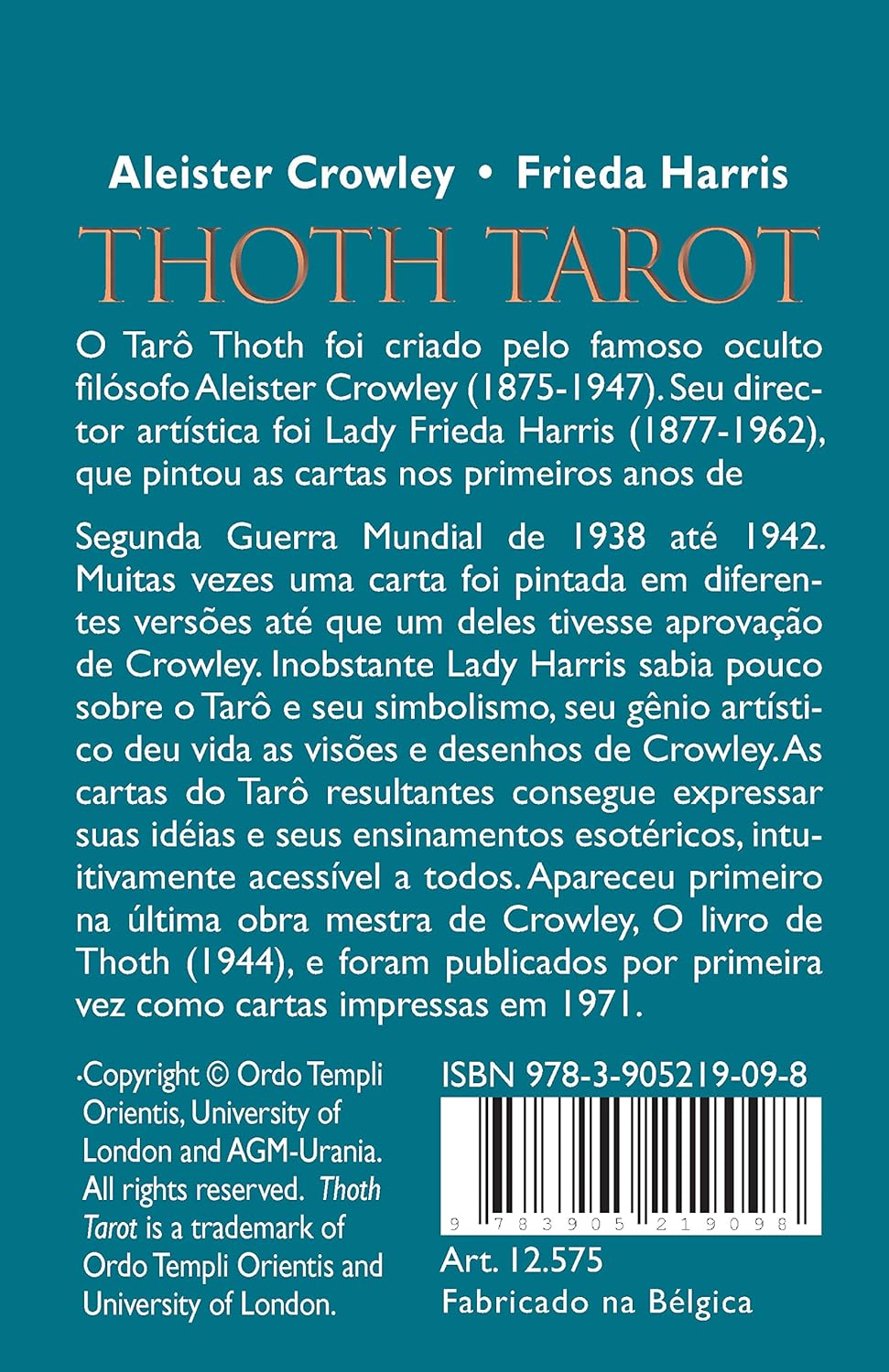 Versão do Tarot de Aleister Crowley em português impresso pela editora AG Muller Contém um baralho com 78 cartas. Inclui livreto com instruções em português de Portugal Esta é a edição em português do famoso Tarô de Aleister Crowley, uma figura misteriosa e controversa, o maior mago do século XX – pintada por Lady Frieda Harris. Este oráculo é uma das pedras angulares da cartomancia e do esoterismo no mundo.