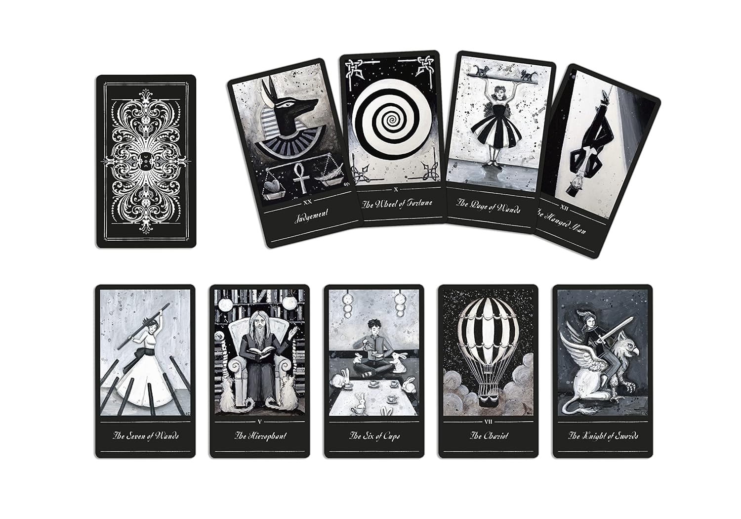 Bem-vindo ao Tarô Phantomwise. Este mundo em preto e branco é um pouco circense, um pouco País das Maravilhas e um pouco uma fantasia noturna de invenção própria. É uma mistura de mito e conto de fadas, onde cada indivíduo que você encontra pode ser uma ilusão, um reflexo ou uma distorção.