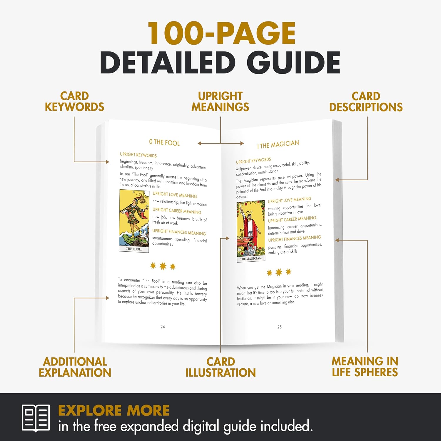 Acompanhamentos Inclusos: Um guia físico detalhado de 100 páginas e um guia digital expandido, apresentando significados das cartas na posição normal e invertida, interpretações para vários aspectos da vida, bem como cores e símbolos — tornando-o o baralho de tarô ideal para aprendizado.