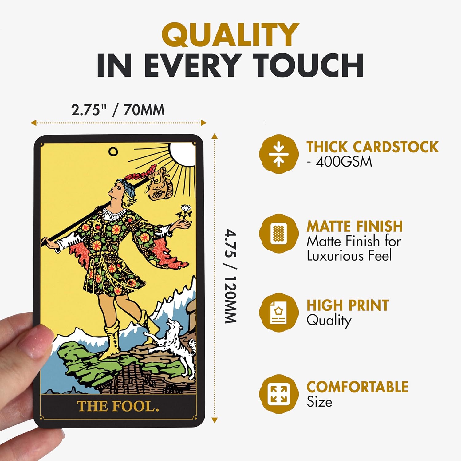 Qualidade e Durabilidade Premium: Feitos com cartolina de 400 g/m², estes baralhos de tarô são projetados para uso prolongado. O acabamento fosco oferece uma sensação suave e luxuosa, além de facilitar o embaralhamento.